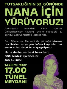 Partizan X Hesabı’ndan (@PartizanMerkez5) yaptığı paylaşımda; “21 Ağustos’tan bu yana Geri Gönderme Merkezi’nde tutulan ve öldürülme tehlikesi olduğu Azerbaycan’a gönderilmek istenen Nana için 12 Ekim Pazar günü Tünel Meydanı’nda yürüyoruz” ifadelerini kullandı ve yapılacak eyleme katılım çağrısı yaptı.